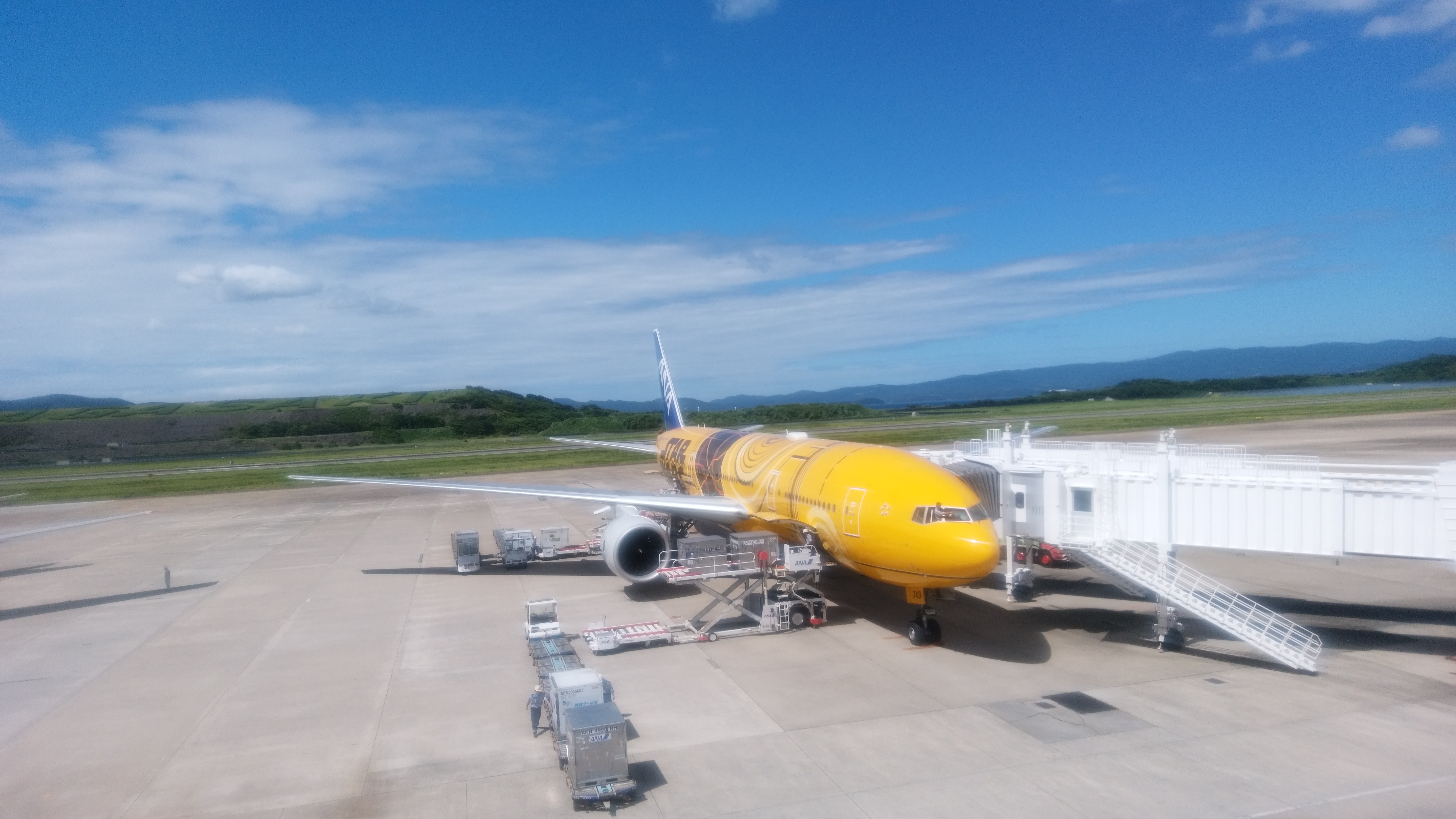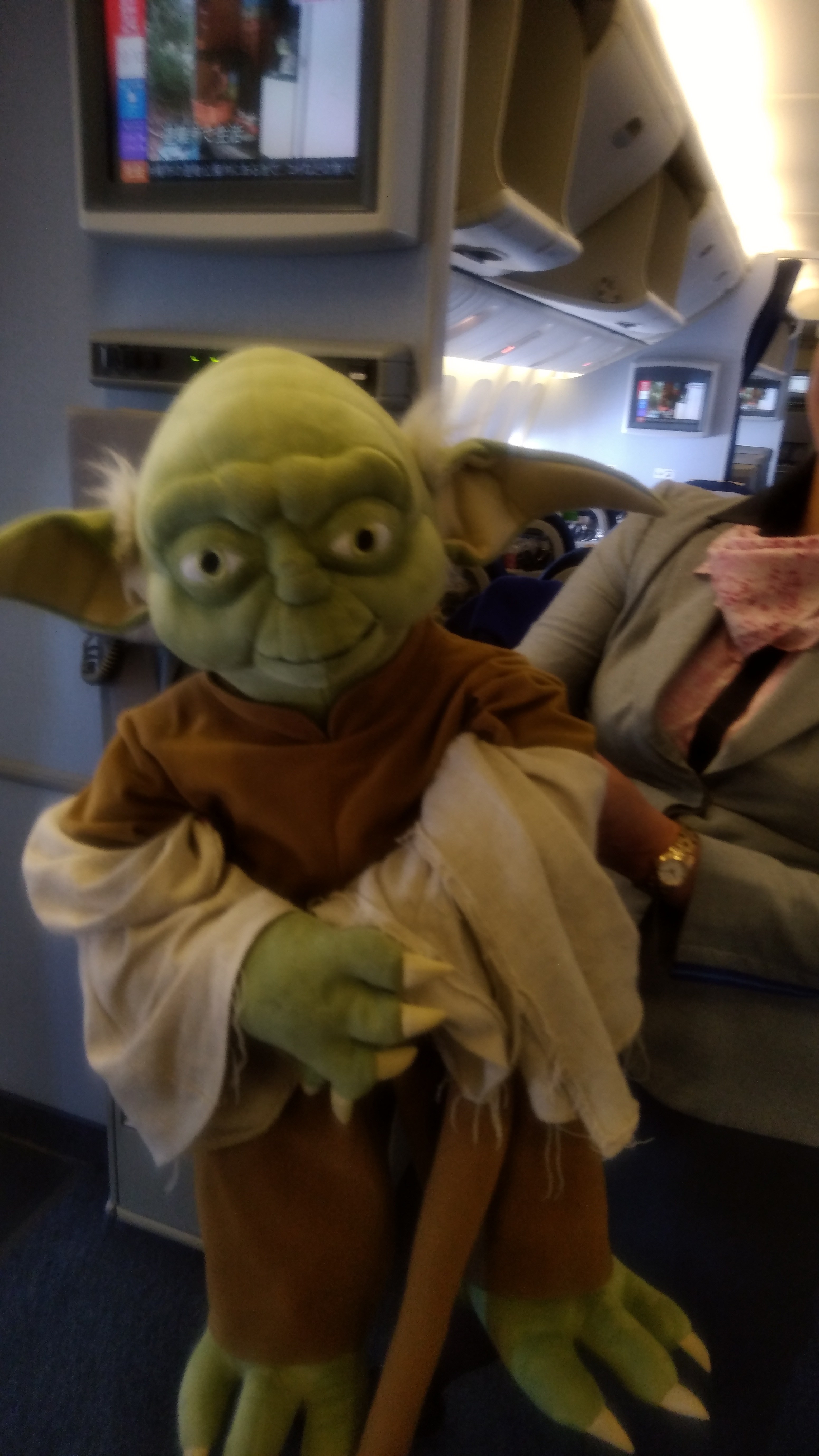 疲れた出張帰り、偶然スタ一ウォーズのR2-D2 カラーのヒコーキに遭遇しました。 なんとヒコーキを降りる時、出口でヨーダ様が、写真撮る時恥ずかしいのでキャビンアテンダントさんに「孫にお土産です」て、嘘言って撮りました。
